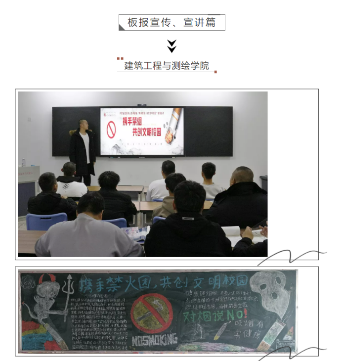 建筑工程与测绘学院以“携手禁烟 共创文明校园”为主题进行了板报绘制、宣讲等宣传活动。