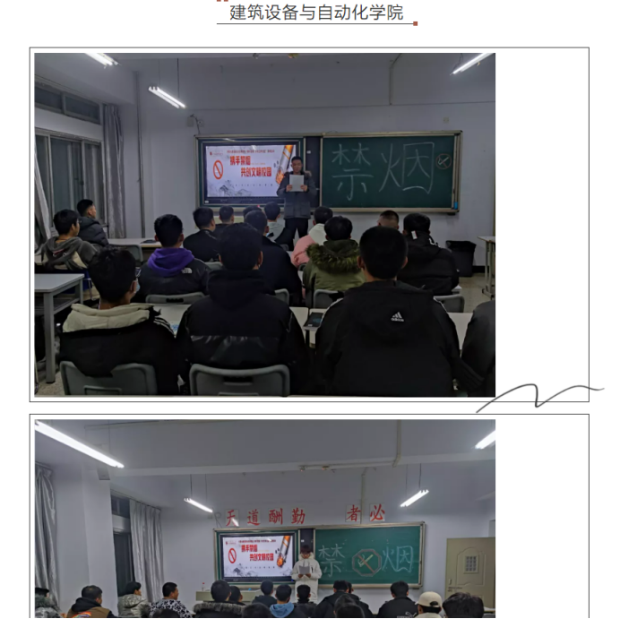 建筑设备与自动化学院以“携手禁烟 共创文明校园”为主题进行了板报绘制、宣讲等宣传活动。