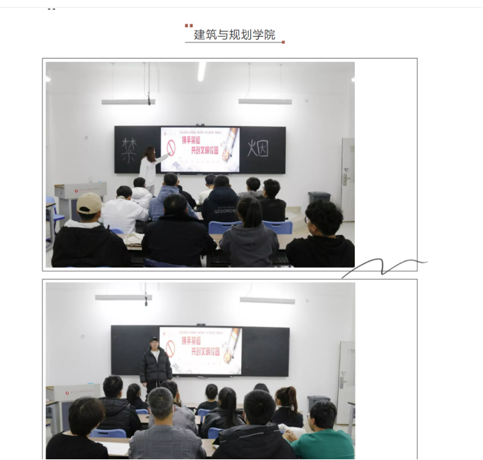 建筑与规划学院以“携手禁烟 共创文明校园”为主题进行了板报绘制、宣讲等宣传活动。